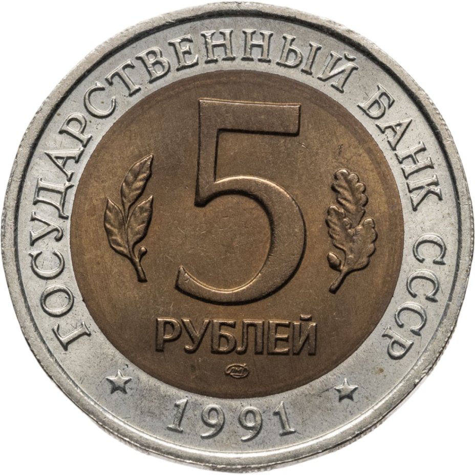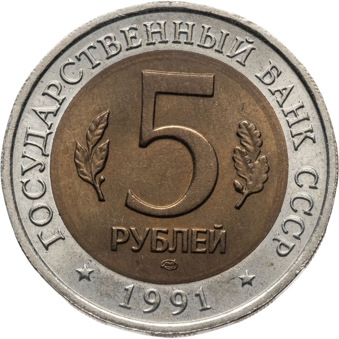 сверху вдоль края монеты слова «ГОСУДАРСТВЕННЫЙ БАНК СССР», внизу год чеканки «1991», в середине номинал «5», слева - лавровая ветвь, справа - дубовая ветвь, ниже слово «РУБЛЕЙ», ниже монограмма монетного двора «ЛМД».