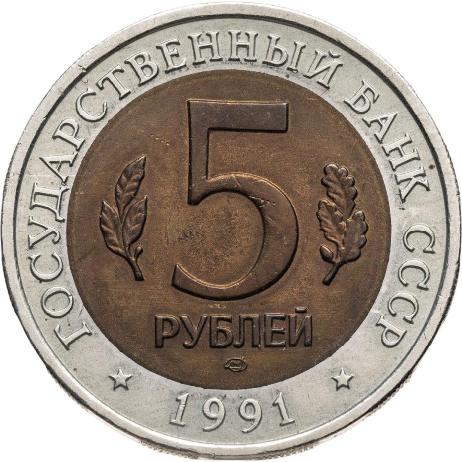 сверху вдоль края монеты слова «ГОСУДАРСТВЕННЫЙ БАНК СССР», внизу год чеканки «1991», в середине номинал «5», слева - лавровая ветвь, справа - дубовая ветвь, ниже слово «РУБЛЕЙ», ниже монограмма монетного двора «ЛМД».