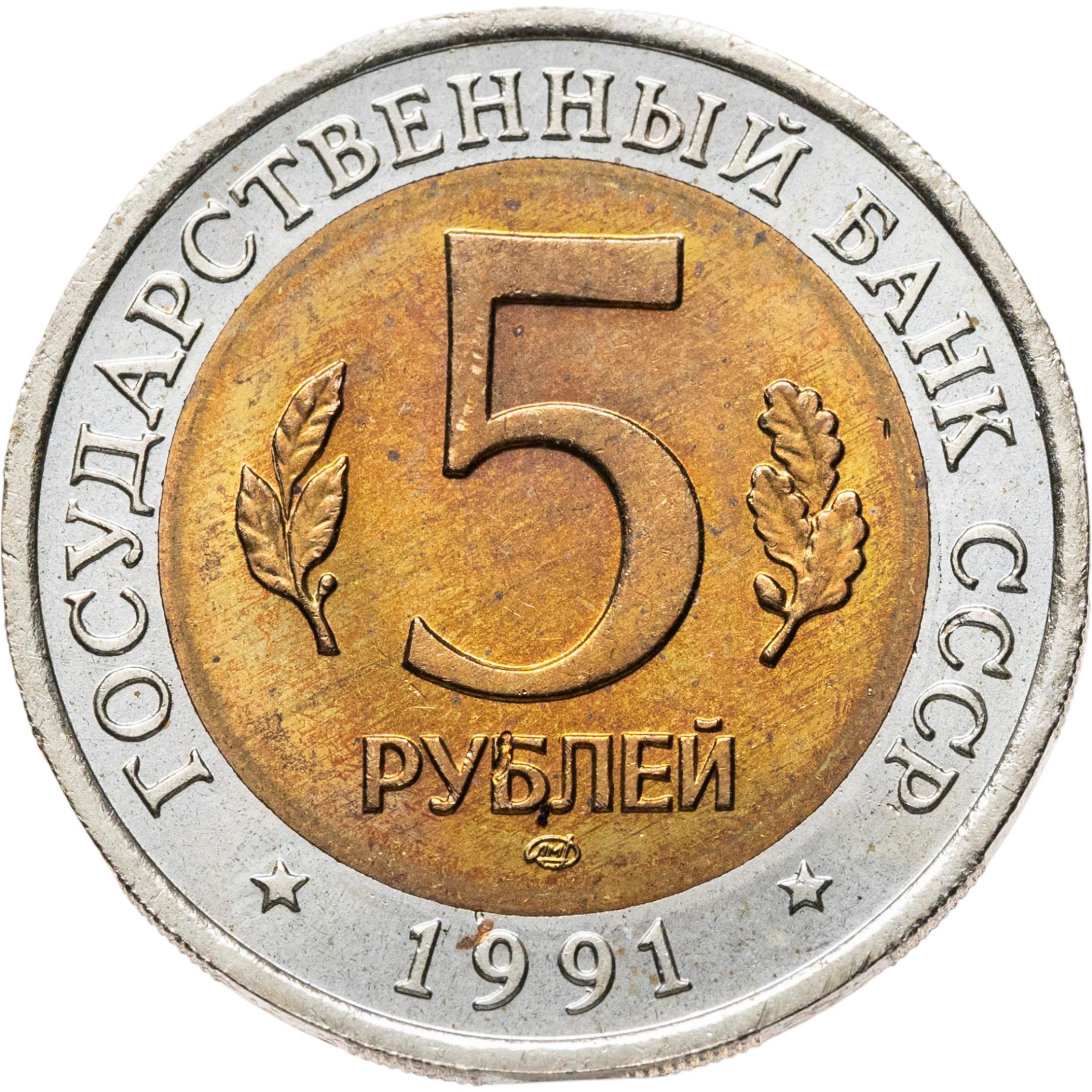 сверху вдоль края монеты слова «ГОСУДАРСТВЕННЫЙ БАНК СССР», внизу год чеканки «1991», в середине номинал «5», слева - лавровая ветвь, справа - дубовая ветвь, ниже слово «РУБЛЕЙ», ниже монограмма монетного двора «ЛМД».