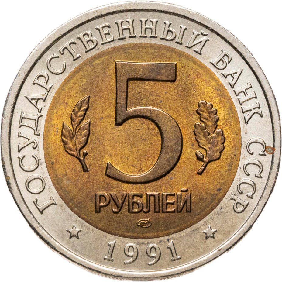 сверху вдоль края монеты слова «ГОСУДАРСТВЕННЫЙ БАНК СССР», внизу год чеканки «1991», в середине номинал «5», слева - лавровая ветвь, справа - дубовая ветвь, ниже слово «РУБЛЕЙ», ниже монограмма монетного двора «ЛМД».