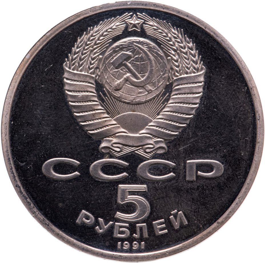 Сверху герб СССР с 15 витками ленты, под ним буквы «СССР», ниже обозначение достоинства монеты цифра «5» и ниже слово «РУБЛЕЙ», внизу у канта год выпуска монеты «1991».