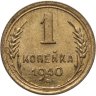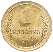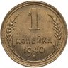 В 1940 году мелкая разменная монета производилась на Ленинградском монетном дворе (ЛМД). 1 копейка 1940 изготовлена из алюминиевой бронзы желтого цвета. Данная копейка чеканилась большими тиражами и в результате имеет 8 различных разновидностей, соотношений штемпелей аверса и реверса.