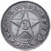 В центре пятиконечной звезды расположена единица номинала, расчерченная мелкими горизонтальными линиями. Между нижними лучами звезды находится дата чеканки "1921". По краям монетного поля венок, собранный из ветвей дуба и лавра, перевязанных бантом. В разрыве венка обозначение денежной единицы "РУБЛЬ". Звезду и венок разделяет ободок, набранный из точек. Известны подгравировки.