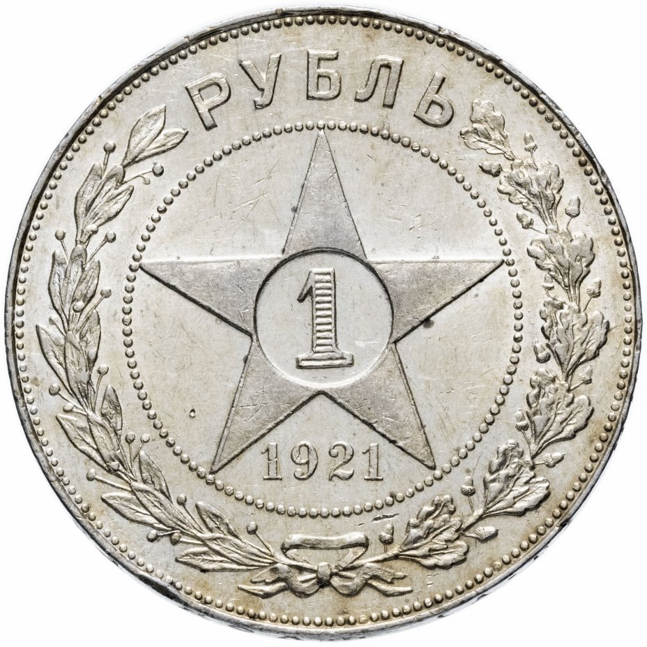В центре пятиконечной звезды расположена единица номинала, расчерченная мелкими горизонтальными линиями. Между нижними лучами звезды находится дата чеканки "1921". По краям монетного поля венок, собранный из ветвей дуба и лавра, перевязанных бантом. В разрыве венка обозначение денежной единицы "РУБЛЬ". Звезду и венок разделяет ободок, набранный из точек. Известны подгравировки.