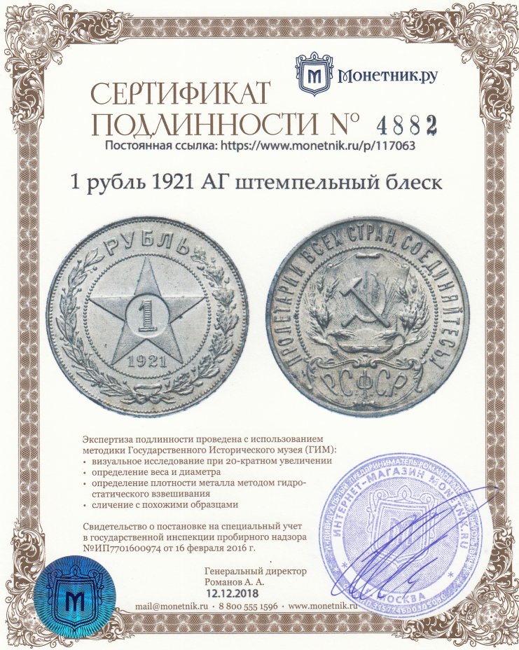 • Сертификат подлинности: № 4882