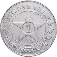 В центре пятиконечной звезды расположена единица номинала, расчерченная мелкими горизонтальными линиями. Между нижними лучами звезды находится дата чеканки "1921". По краям монетного поля венок, собранный из ветвей дуба и лавра, перевязанных бантом. В разрыве венка обозначение денежной единицы "РУБЛЬ". Звезду и венок разделяет ободок, набранный из точек. Известны подгравировки.