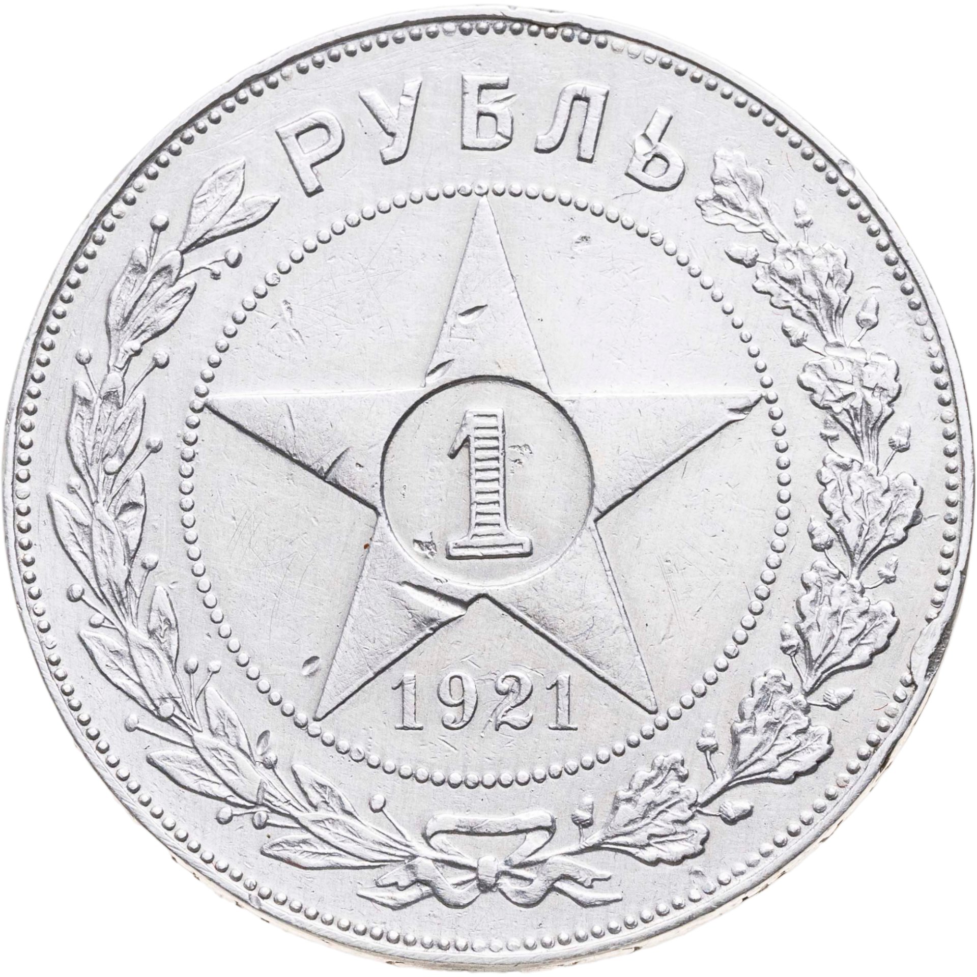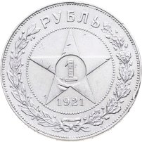 В центре пятиконечной звезды расположена единица номинала, расчерченная мелкими горизонтальными линиями. Между нижними лучами звезды находится дата чеканки "1921". По краям монетного поля венок, собранный из ветвей дуба и лавра, перевязанных бантом. В разрыве венка обозначение денежной единицы "РУБЛЬ". Звезду и венок разделяет ободок, набранный из точек. Известны подгравировки.