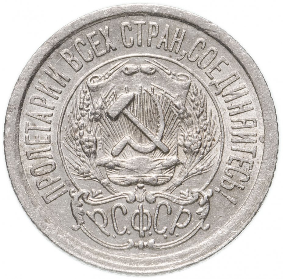 В центре изображён герб молодого государства - скрещенные серп и молот на фоне щитка, снизу которого восходит солнечный диск со множеством лучей, слева и справа щит обрамлён пшеничными колосьями. Под гербом надпись Р.С.Ф.С.Р. (Российская Советская Федеративная Социалистическая Республика). По кругу надпись-лозунг, отделённая от герба линейным ободком: "пролетарии всех стран, соединяйтесь!"