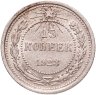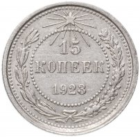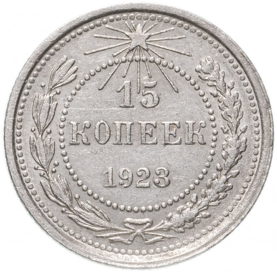 В точечном ободке указан номинал - цифра 15 под ней слово копеек, ниже дата 1923. Вдоль канта, большой точечный ободок, между ним и внутренним изображение венка из лавровой и дубовой ветвей, которые в нижней части связаны лентой с бантом. Сверху над номиналом пятиконечная звездочка в стороны от которой расходятся лучи разной длинны.