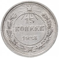 В точечном ободке указан номинал - цифра 15 под ней слово копеек, ниже дата 1923. Вдоль канта, большой точечный ободок, между ним и внутренним изображение венка из лавровой и дубовой ветвей, которые в нижней части связаны лентой с бантом. Сверху над номиналом пятиконечная звездочка в стороны от которой расходятся лучи разной длинны.