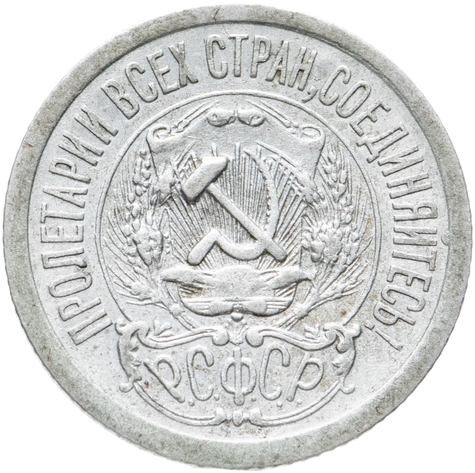 В центре изображён герб молодого государства - скрещенные серп и молот на фоне щитка, снизу которого восходит солнечный диск со множеством лучей, слева и справа щит обрамлён пшеничными колосьями. Под гербом надпись Р.С.Ф.С.Р. (Российская Советская Федеративная Социалистическая Республика). По кругу надпись-лозунг, отделённая от герба линейным ободком: "пролетарии всех стран, соединяйтесь!"