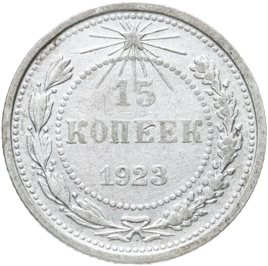 В точечном ободке указан номинал - цифра 15 под ней слово копеек, ниже дата 1923. Вдоль канта, большой точечный ободок, между ним и внутренним изображение венка из лавровой и дубовой ветвей, которые в нижней части связаны лентой с бантом. Сверху над номиналом пятиконечная звездочка в стороны от которой расходятся лучи разной длинны.