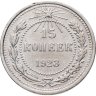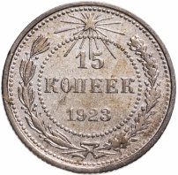 В точечном ободке указан номинал - цифра 15 под ней слово копеек, ниже дата 1923. Вдоль канта, большой точечный ободок, между ним и внутренним изображение венка из лавровой и дубовой ветвей, которые в нижней части связаны лентой с бантом. Сверху над номиналом пятиконечная звездочка в стороны от которой расходятся лучи разной длинны.