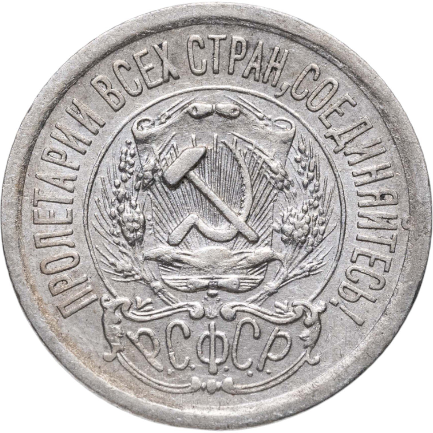В центре изображён герб молодого государства - скрещенные серп и молот на фоне щитка, снизу которого восходит солнечный диск со множеством лучей, слева и справа щит обрамлён пшеничными колосьями. Под гербом надпись Р.С.Ф.С.Р. (Российская Советская Федеративная Социалистическая Республика). По кругу надпись-лозунг, отделённая от герба линейным ободком: "пролетарии всех стран, соединяйтесь!"