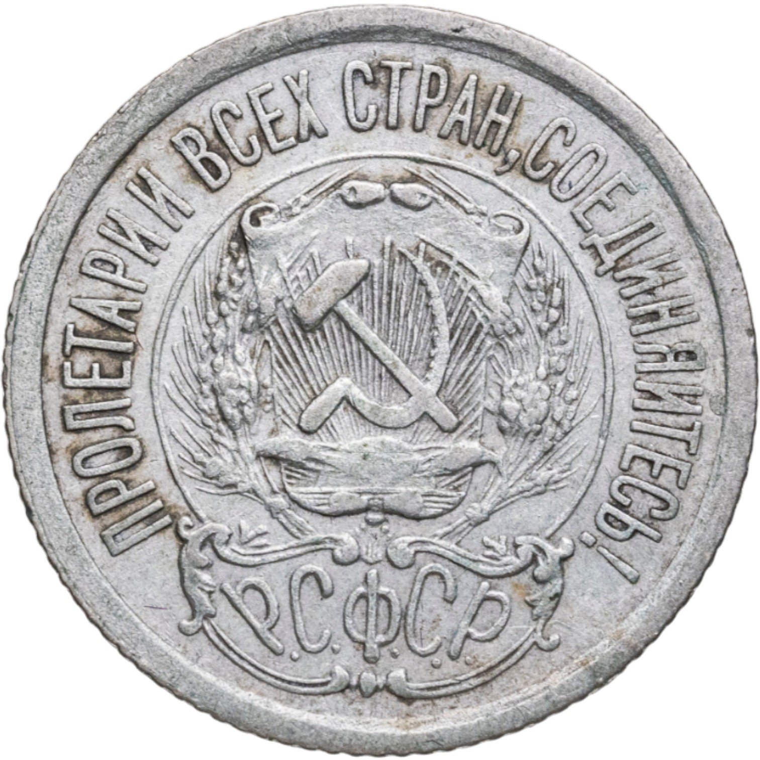 В центре изображён герб молодого государства - скрещенные серп и молот на фоне щитка, снизу которого восходит солнечный диск со множеством лучей, слева и справа щит обрамлён пшеничными колосьями. Под гербом надпись Р.С.Ф.С.Р. (Российская Советская Федеративная Социалистическая Республика). По кругу надпись-лозунг, отделённая от герба линейным ободком: "пролетарии всех стран, соединяйтесь!"