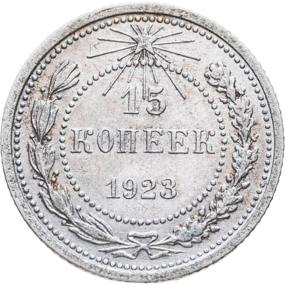 В точечном ободке указан номинал - цифра 15 под ней слово копеек, ниже дата 1923. Вдоль канта, большой точечный ободок, между ним и внутренним изображение венка из лавровой и дубовой ветвей, которые в нижней части связаны лентой с бантом. Сверху над номиналом пятиконечная звездочка в стороны от которой расходятся лучи разной длинны.