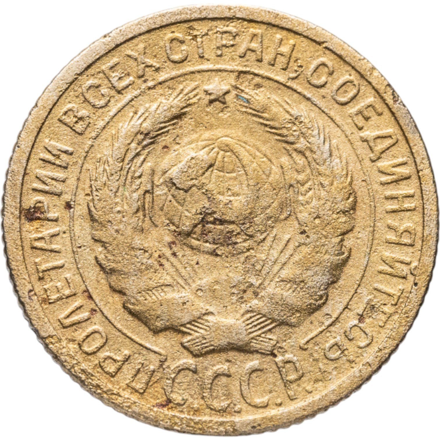 Штемпель 1.1. круговая надпись удалена от выступающего канта монеты, острие серпа расположено выше полюса, герб СССР - 7 витков