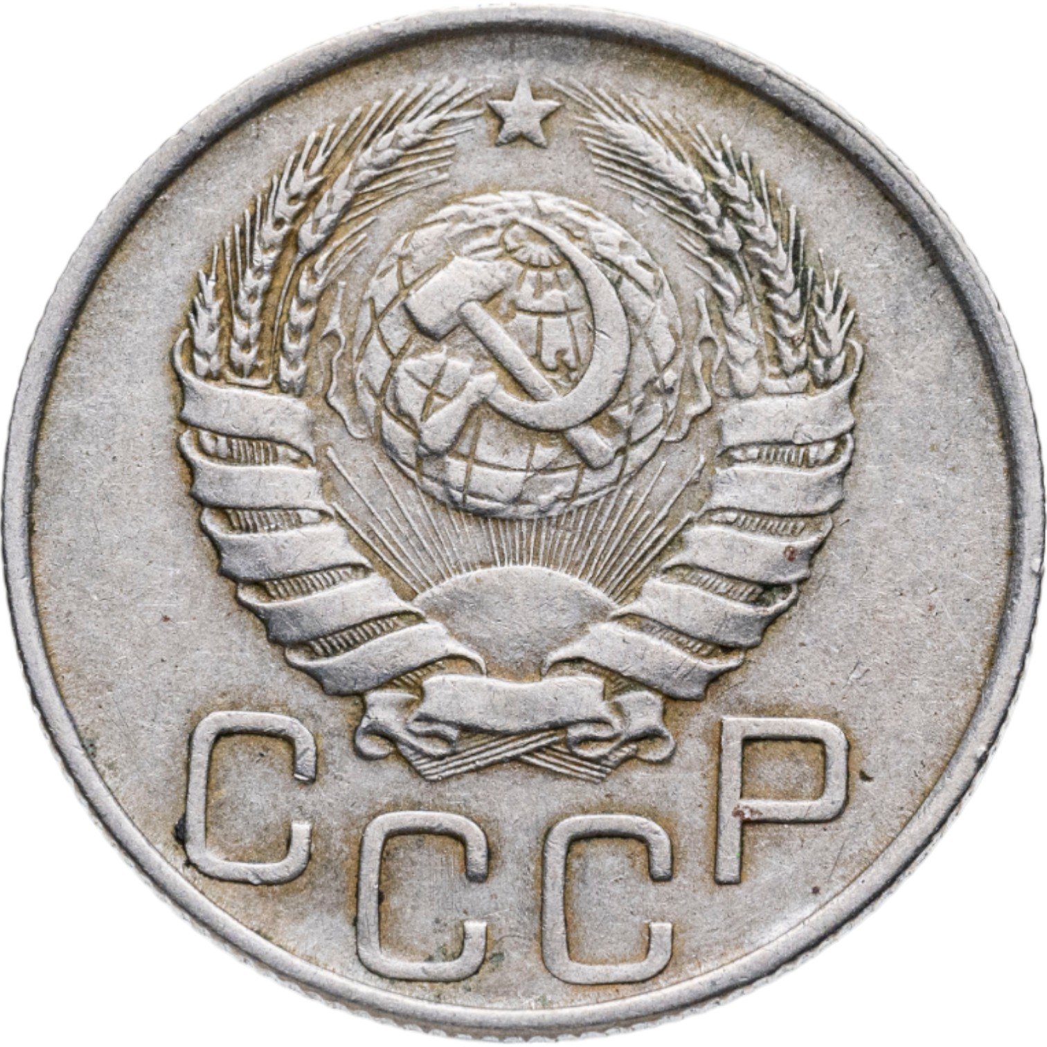 Штемпель 1.12. 20 копеек 1937 г., верхняя ость крайнего правого внешнего колоса длинная, к левому нижнему лучу звезды подходят 8 остей, герб СССР - 11 витков ленты.