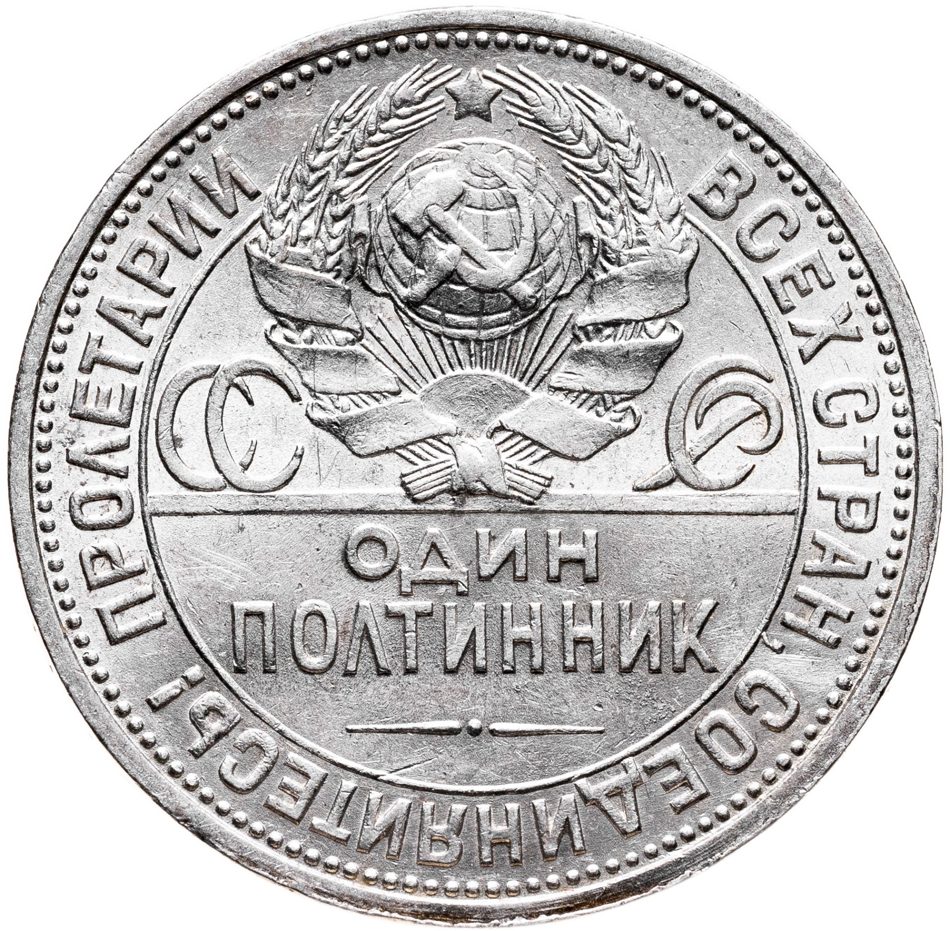 Герб изображён с семью витками ленты (по количеству союзных республик), поверхность земного шара выпуклая, слева и справа буквы СССР, под гербом поле разделено тонкой горизонтальной чертой, снизу надпись "ОДИН ПОЛТИННИК". Ниже элемент оформления - две прямые разделённые точкой. По кругу, между внешним точечным и внутренним линейным ободками - надпись - призыв "ПРОЛЕТАРИИ ВСЕХ СТРАН, СОЕДИНЯЙТЕСЬ!", запятая после слова "СТРАН" касается линейного ободка.