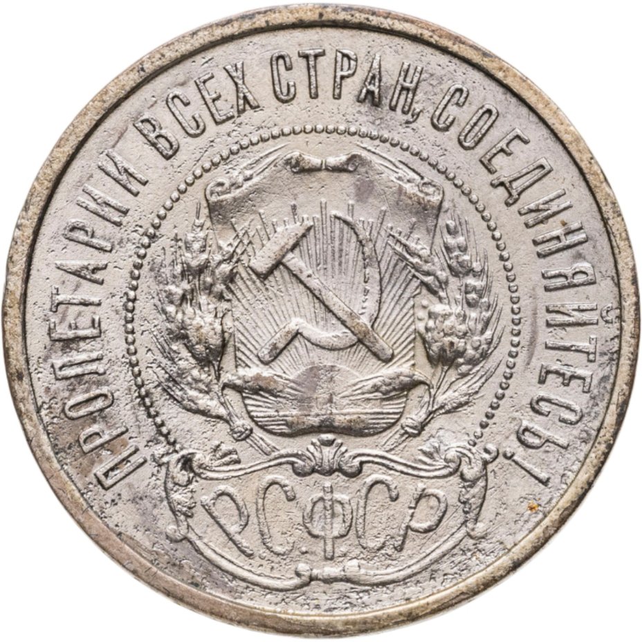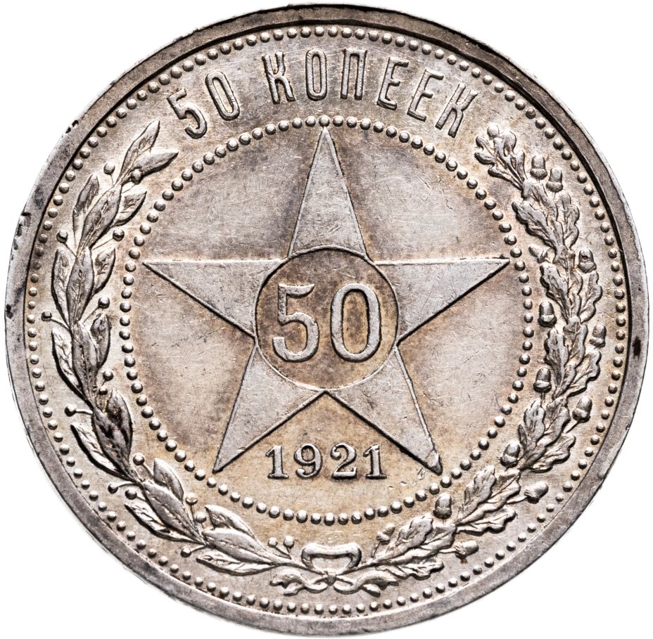Последними, но не первыми — серебряные пятидесятикопеечники чеканились с 1921 года. Впрочем, в обороте РСФСР они практически не встречались, так как фактически были выпущены в денежное обращение в 1924 году уже при СССР. Причина — огромные темпы инфляции в 1921-1923 гг. В те годы денежная масса состояла из бумажных совзнаков достоинством до 100 000 рублей. Стоит ли говорить о том, что реальная стоимость драгоценного металла превышала номинал монеты в сотни (а то и тысячи!) раз?
