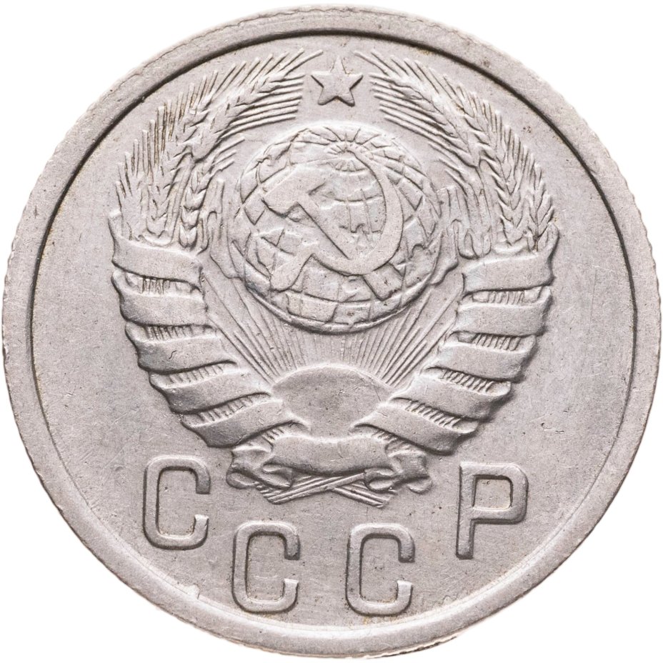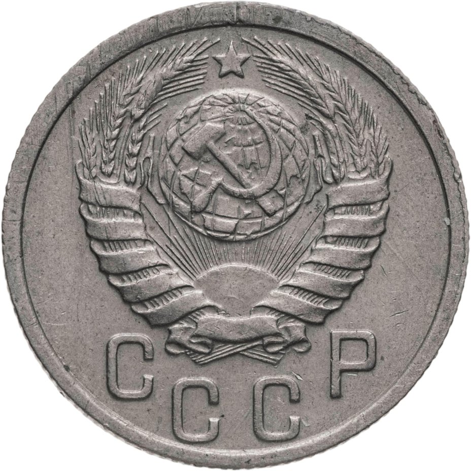 - Номинал в восьмигранном щитке, окружённом дубовой ветвью. Выпуск с 1935 года: 10, 15, 20 копеек.