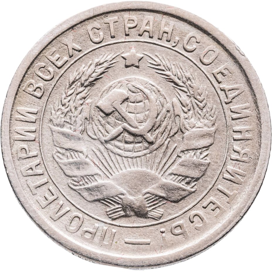 - Рабочий с молотком в руке поддерживает щит, на котором выгравирован номинал. Эти монеты появились с 1931 года, тираж малый из-за сложности изображения. Номиналы: 10, 15, 20 копеек.