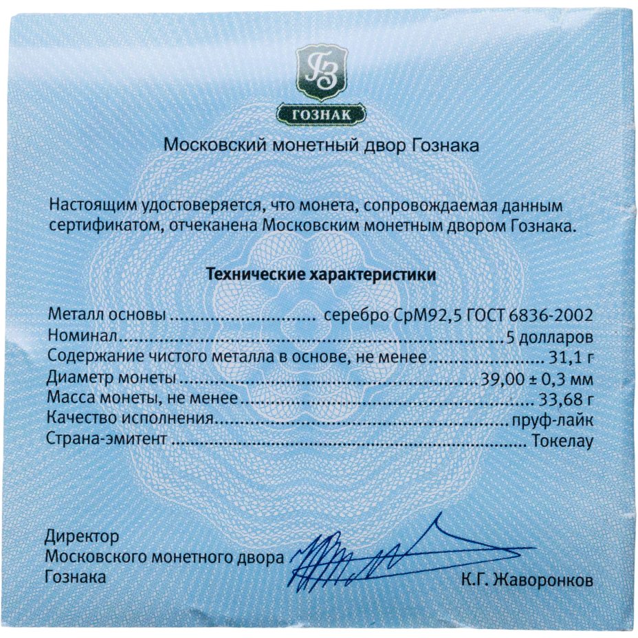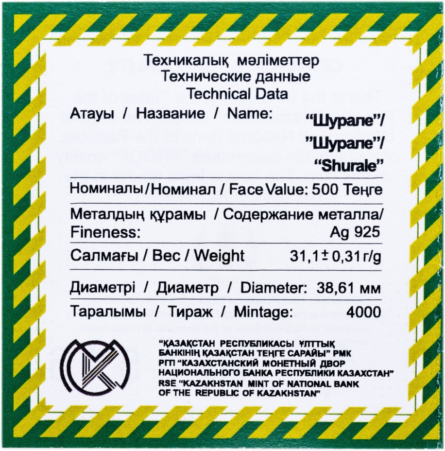 - Тираж: Монетный двор: Усть-Каменогорск, Казахстан; Знак: ҚҰБ; Proof=4000 шт.