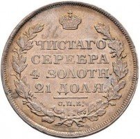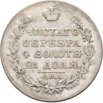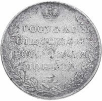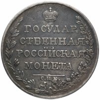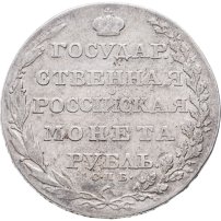 Оформление оборотной стороны первых лет чеканки взято с утверждённого пробного рубля, датированного 1801 годом. В обрамлении перевязанных снизу ветвей лавра и дуба чеканится надпись «ГОСУДАРСТВЕННАЯ РОССIЙСКАЯ МОНЕТА РУБЛЬ», под которой обозначен монетный двор (СПБ). Гуртовое оформление выпуклой надписью указывает чистоту металла в золотниковой пробе: «ВОСЕМЬДЕСЯТЪ ТРЕТЕИ СЪ ОДНОЮ ТРЕТЬЮ ПРОБЫ» (868-я проба). Рублёвая монета весит 20,73 грамма (18 грамм чистого серебра) при диаметре 37,5 мм.