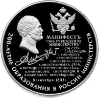 Монеты «200-летие образования в России министерств» номиналом 1 рубль выпущены тиражом 3000 экземпляров для каждой позиции, 10 рублей – по 5 миллионов экземпляров, 25-рублёвые монеты – 1500 экземпляров.