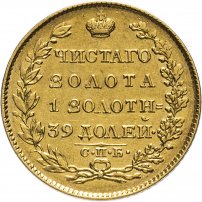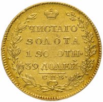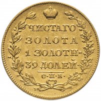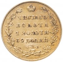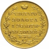 В таком виде золотые монеты 5 рублей чеканились все оставшиеся годы правления Александра I и в первый период правления его брата – императора Николая I. С 1832 года монеты этого номинала, сохранившие габариты и пробу золота, начали чеканить с изменённым дизайном.