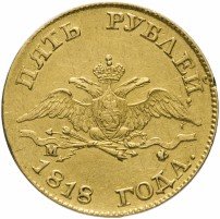 В 1817 году был отчеканен первый тираж монет 5 рублей, которые в среде нумизматов называют «с орлом с опущенными крыльями» или «с орлом с крыльями вниз». Изменённого гербового орла, который занимает всю центральную часть аверса, также называют «масонским орлом» - его крылья распростёрты в стороны/вниз, между головами расположена императорская корона, в лапах орёл держит пучок стрел и лавровый венок. На оборотной стороне появилась крупная надпись о содержании чистого золота в составе монеты.