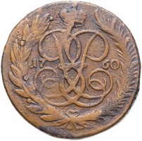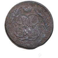 Елизаветинский пятак стал самым крупным номиналом медного монетного ряда 1757-1762 гг. В отличие от монет меньшего достоинства на его лицевой стороне чеканили не конника в латах, разящего змея, а Государственный герб – двуглавого орла, под которым прописью указывался номинал. В центре оборота красовался коронованный вензель императрицы – две буквы «I» и «Е», переплетённые меж собой и своим зеркальным отражением. Причём «I» с верхней завитушкой от «Е» можно было воспринимать как «Р», что напрямую уводило к очертаниям любимого вензеля Петра I и отчеству императрицы – Петровна. По сторонам от вензеля расположились спаренные цифры даты. Вдоль канта шёл венок из лавровой и пальмовой ветвей. Для защиты от подделок гурт покрывали сетчатым узором. Нормативный вес медных 5 копеек составлял 51,19 грамма при диаметре 41 мм.