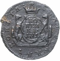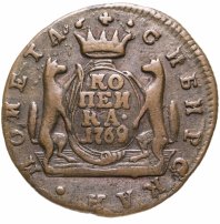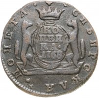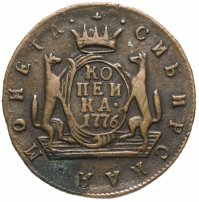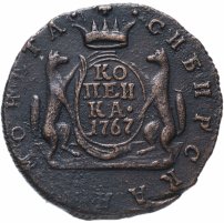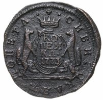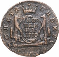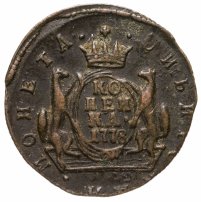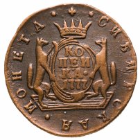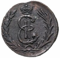 Однокопеечная монета завершает младшую группу номиналов сибирской линейки. Из-за 25-рублёвой стопы сибирская копейка легче общеимперского аналога. Она весит 6,6 грамма при диаметре 23 миллиметра. Толщина не позволяла качественно нанести на её гурт обозначение «КОЛЫВАНСКАЯ МЕДЬ», присущее старшим номиналам. Поэтому гурт сибирских копеек был шнуровидным с самого начала чеканки. Монеты 1766 года и небольшая часть тиража с датой «1767» не имеют букв под екатерининским вензелем на аверсе. С 1767 года на всех сузунских монетах начинается простановка букв «К» и «М», обозначающих всю ту же особую колыванскую медь. Формально сибирская копейка чеканилась до 1780 года включительно. Однако реальную чеканку прекратили раньше, поскольку копеечные монеты с датой «1780» известны только в качестве новоделов (по этой причине мы не включили эту позицию в данную коллекцию).