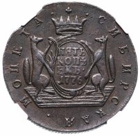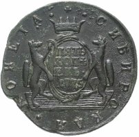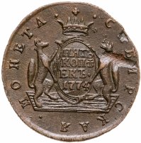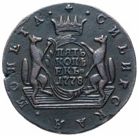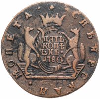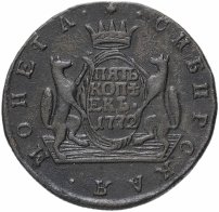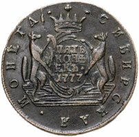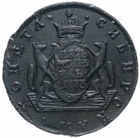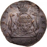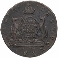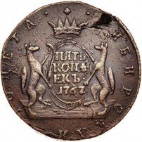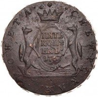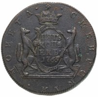 Можно сказать, что именно 5 копеек формально считаются отправной точкой сибирской монеты. Известен уникальный экземпляр медного пятака с датой «1757» и елизаветинским вензелем на одной из сторон и гербом Сибирского царства – на другой. Однако о точной дате его чеканки нумизматы продолжают спорить. Ведь именной указ о выпуске шести номиналов монет по особой стопе был подписан лишь 7 ноября 1763 года.
