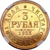 Инициалы Николая Иоссы фигурируют на монетах 3 рубля золотом 1869-1877 гг; Николая Фоллендорфа – 1877-1882 гг; Дмитрия Сабанеева – на монетах 1883 года; Аполлона Грасгофа – 1883-1885 гг. Таким образом, монеты 3 рубля золотом 1877 и 1883 годов существуют в двух разновидностях – с инициалами разных минцмейстеров.