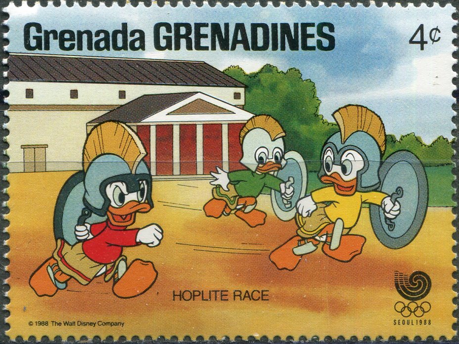 Купить Гренада Гренадины Почтовая марка  1988 "Дисней. Гонка гоплитов - Хьюи, Луи, Дьюи"