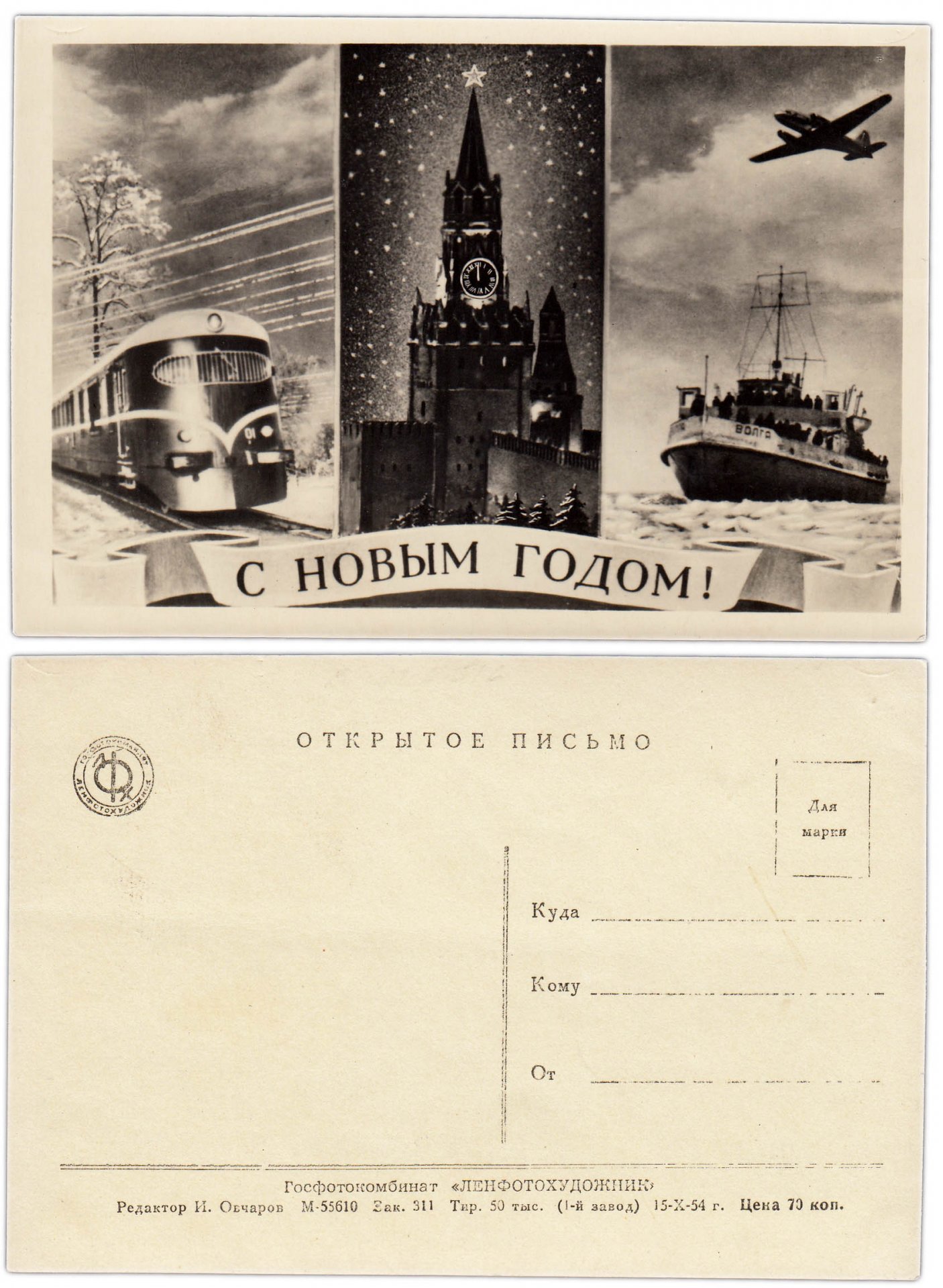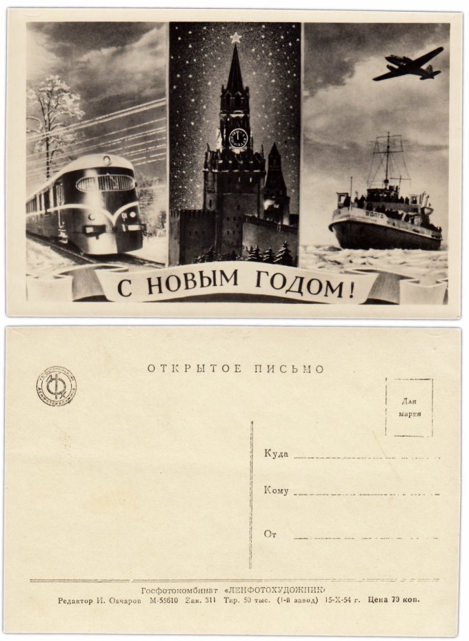 Открытка (открытое письмо) "С Новым Годом!" Госфотокомбинат "ЛЕНФОТОХУДОЖНИК" 1954