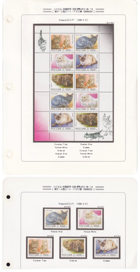 Россия набор из 5 марок из блока 10 марок 1996 "Кошки"