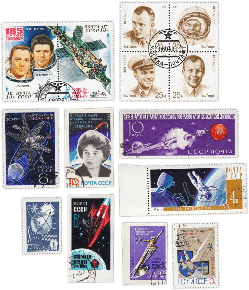 Купить Набор марки и квартблоки 10 штук "Космос. Наши космонавты. Гагарин, Терешкова. Попов, Рюмин" СССР