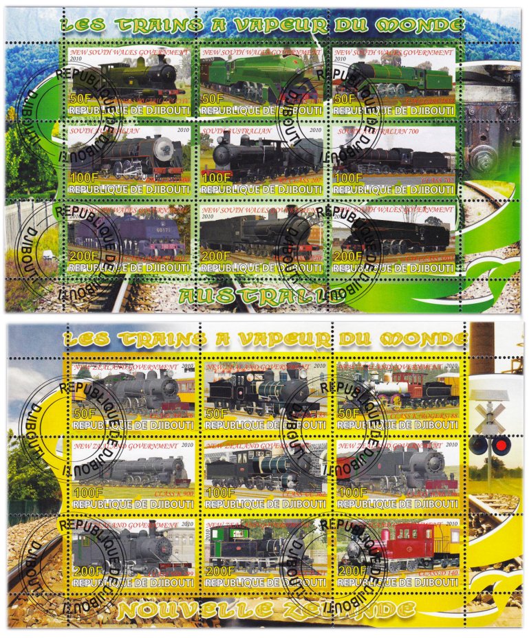 Джибути марки набор из 2 квартблоков "Ретро поезда. Австралия и Новая Зеландия"