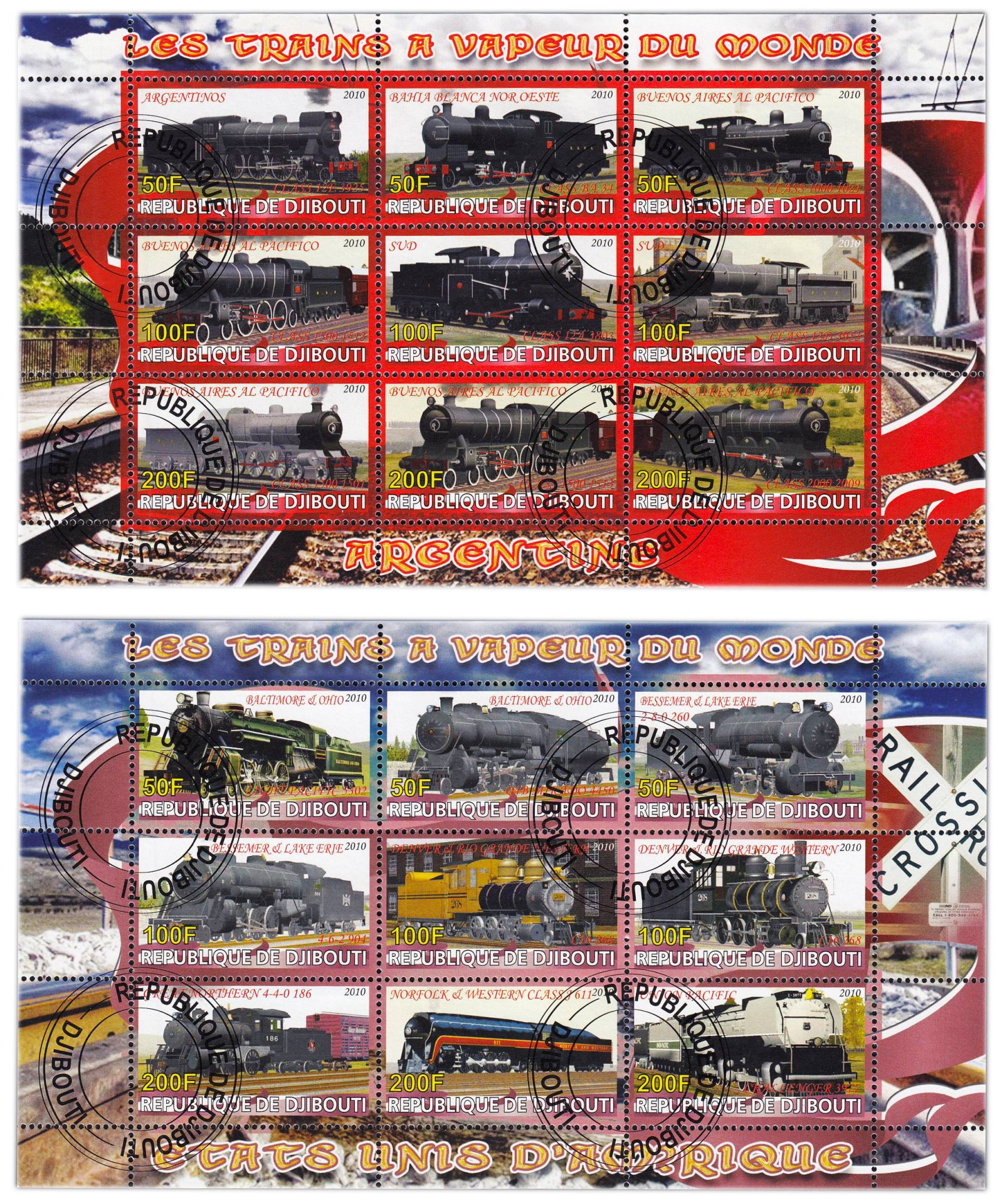 Джибути марки набор из 2 квартблоков "Ретро поезда. США и Аргентина"
