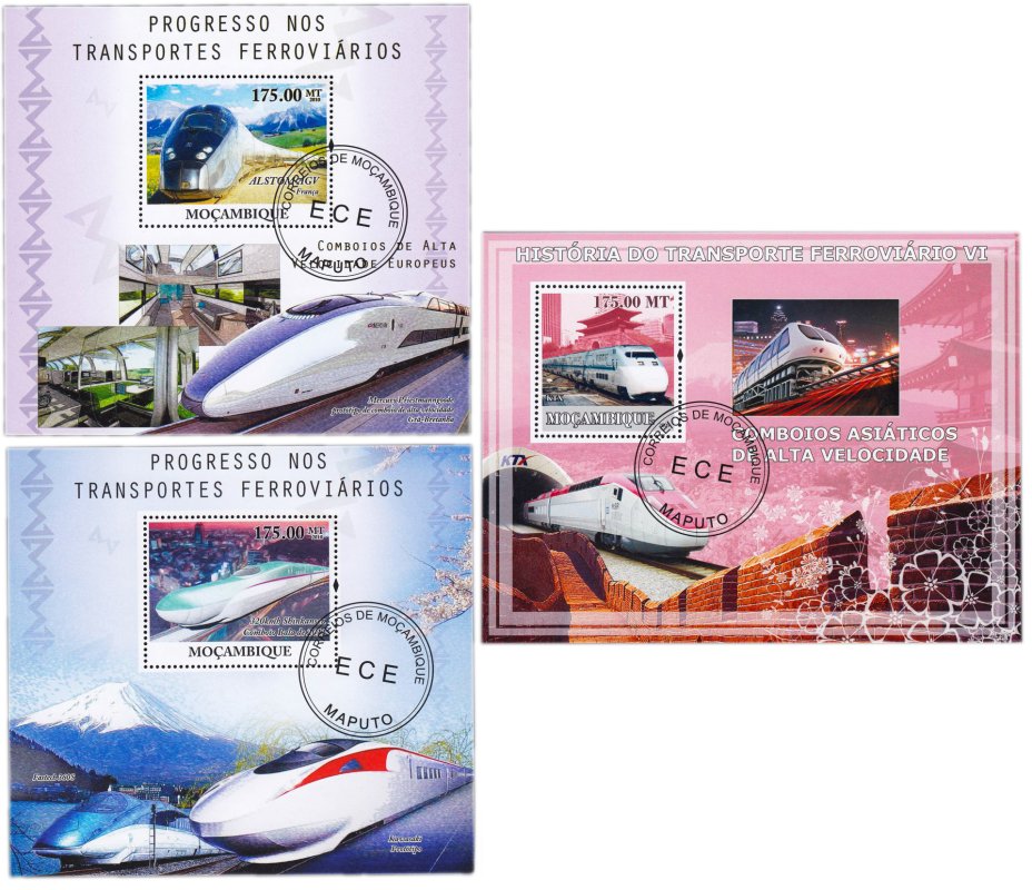 Мозамбик марки набор из 3 квартблоков "Поезда"