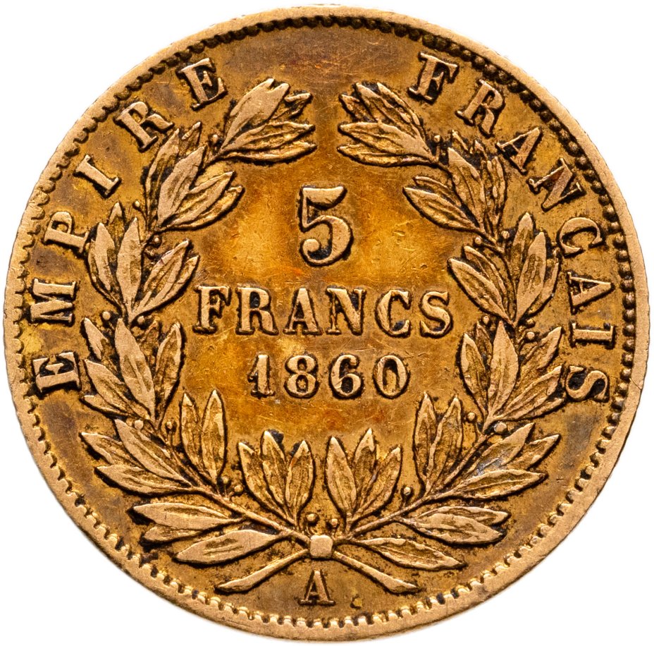 Франция 5 франков (francs) 1860, знак монетного двора: "A" - Париж