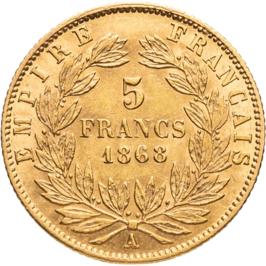 Франция 5 франков (francs) 1868 A Золото знак монетного двора: "A" - Париж