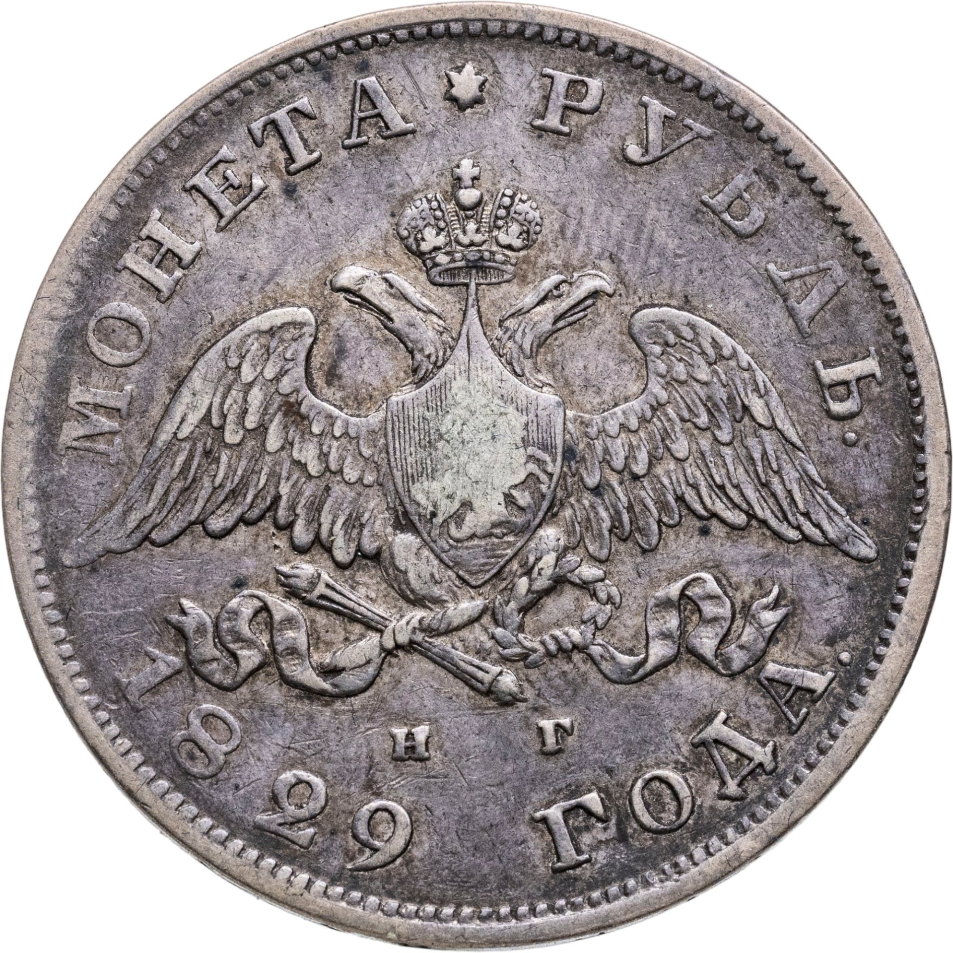 В центре изображен Государственный Герб Российской империи - двуглавый орёл с распростёртыми и опущенными вниз крыльями. На груди орла расположен Московский герб - щит с изображением Георгия Победоносца, поражающего копьем дракона. Гербовый щит, над головами орла, венчает императорская корона. Орёл держит, перевитые орденской лентой ордена Св. Апостола Андрея Первозванного, громовые стрелы и факел в правой лапе и лавровый венок — в левой. Под лентой буквы: слева «Н», справа «Г». Инициалы минцмейстера Николая Грачева. Над орлом обозначение номинала - круговая надпись «МОНЕТА РУБЛЬ.» разделённая шестиконечной звездой. Под орлом — дата выпуска монеты «1829 ГОДА.». По окружности канта имеются рельефные элементы, выполненные в виде зубцов.