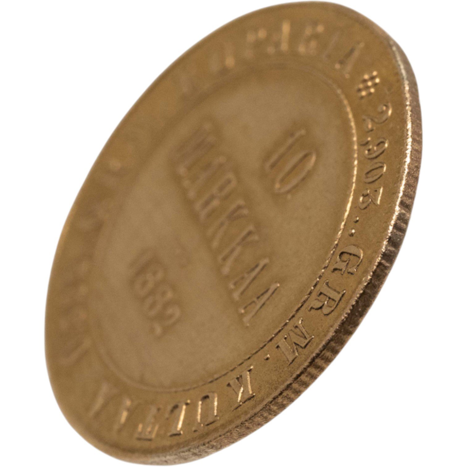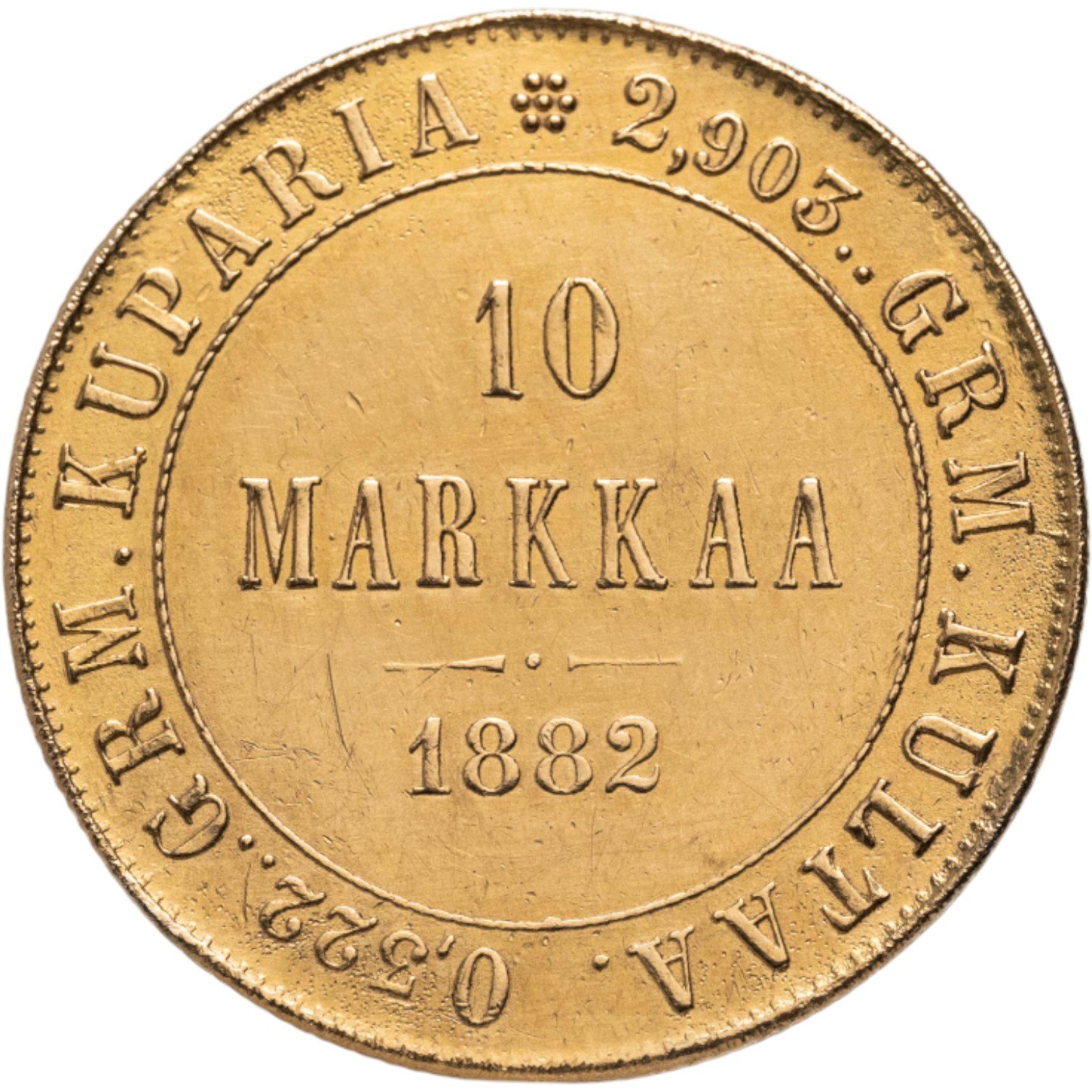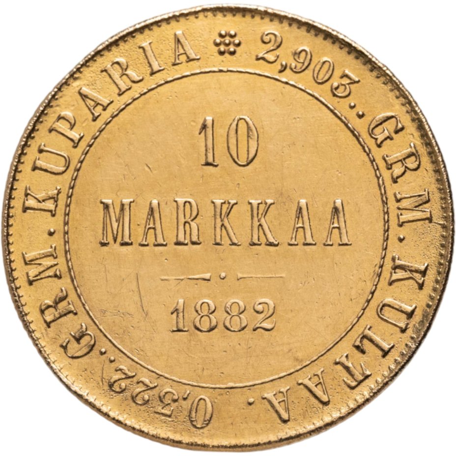В центре слово «MARKKAA». Над словом указан номинал - цифра «10». Под словом расположен декоративный разделитель в виде двух разнонаправленных фигурных линий и точки между ними. Под разделителем — дата выпуска монеты «1882». Вокруг центрального изображения - витой ободок. За ободком круговая надпись: «2,903..GRM. KULTAA. 0,322..GRM. KUPARIA.», сверху разделённая стилизованной розеткой из семи точек. По окружности канта имеются рельефные элементы, выполненные в виде зубцов.