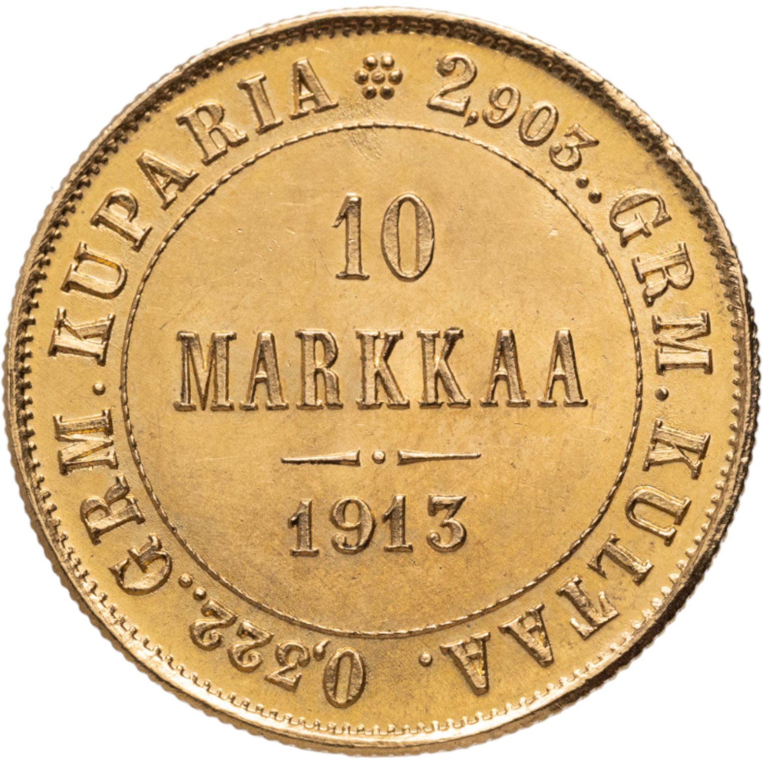 В центре слово «MARKKAA». Над словом указан номинал - цифра «10». Под словом расположен декоративный разделитель в виде двух разнонаправленных фигурных линий и точки между ними. Под разделителем — дата выпуска монеты «1913». Вокруг центрального изображения - витой ободок. За ободком круговая надпись: «2,903..GRM. KULTAA. 0,322..GRM. KUPARIA.», сверху разделённая стилизованной розеткой из семи точек. По окружности канта имеются рельефные элементы, выполненные в виде зубцов.