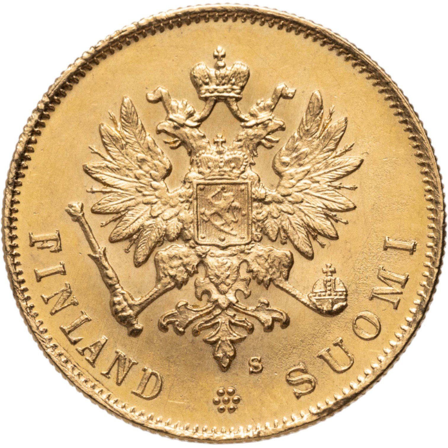 В центре изображён полный Герб Великого княжества Финляндского - двуглавый орёл, головы которого увенчаны двумя коронами, третья, большая корона над ними. Все они соединены орденской лентой ордена Св. Апостола Андрея Первозванного. На груди орла расположен щит с титульным гербом Великого князя Финляндского, увенчанный княжеской короной. Вокруг щита орденская цепь с орденом Св. Апостола Андрея Первозванного. В правой лапе орла – скипетр, в левой – держава. Под хвостом, справа, знак директора Гельсингфосского монетного двора - литера «S», Isak Gustaf Sundell (Исаак Густаф Сундель). Внизу, вдоль канта, полукругом надпись: «FINLAND SUOMI», разделённая стилизованной розеткой из семи точек. По окружности канта имеются рельефные элементы, выполненные в виде зубцов.