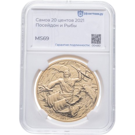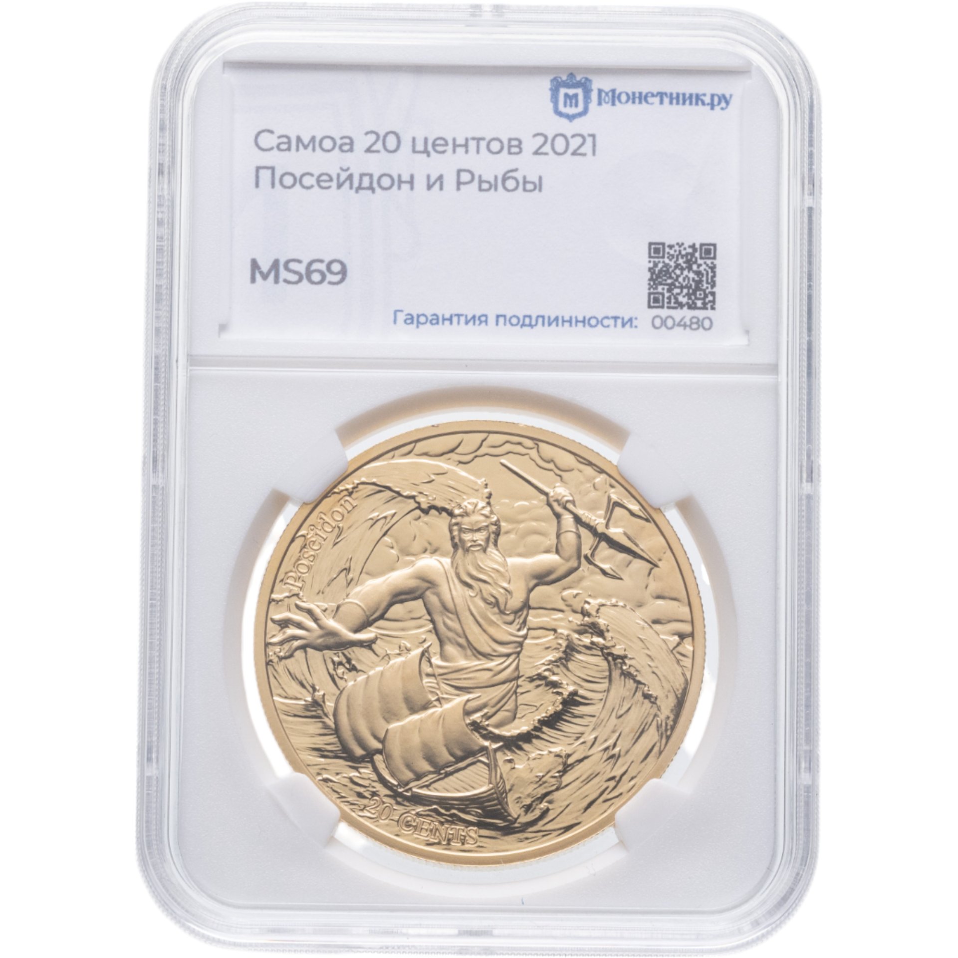 Самоа 20 центов (cents) 2021 "12 Олимпийских богов в зодиаке - Посейдон и Рыбы" в слабе Монетник.ру MS69