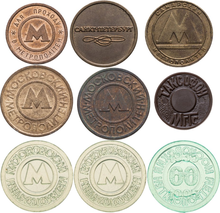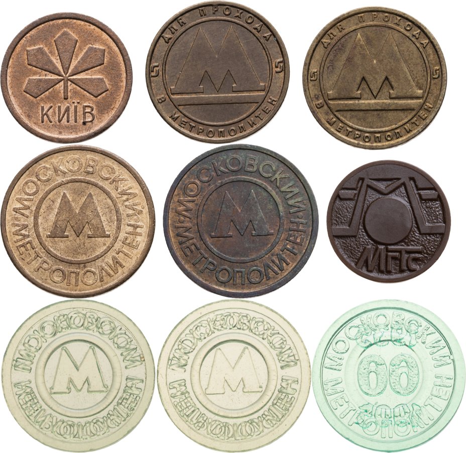 Набор из 9 жетонов метрополитена и телефона Москвы, Санкт-Петербурга, Самары и Киева